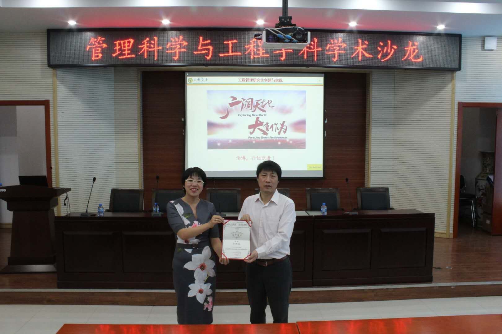 经过邓小鹏教授的讲解,同学们对工程管理研究生创新实践与自科基金申报有了更为深刻的认识和理解。同学们也针对报告的内容向专家提出了自己的疑问和思索,老师耐心的解答,让同学们收获良多。报告最后,刘洁老师为邓小鹏教授颁发了荣誉证书。至此,管理科学与工程学科第2期学术沙龙圆满结束!(图片作者:谭宪宇;文字作者:工程管理系员工会)