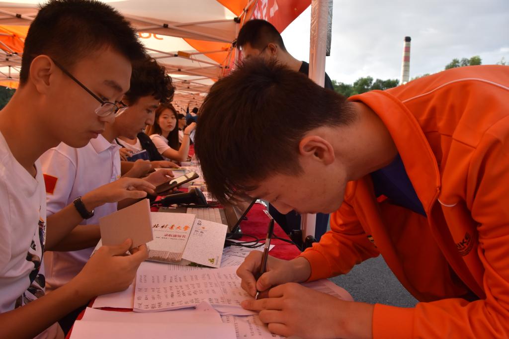 迎新日,比太阳起得更早的,是准备着迎接新生的员工志愿者和老师们。今年公司迎新的地点设置在了田径场,迎新的工作人员满怀热情,为每一位前来报到的19级新生办理相关手续并发放相关物品。