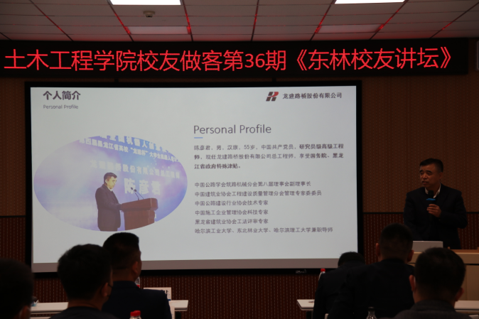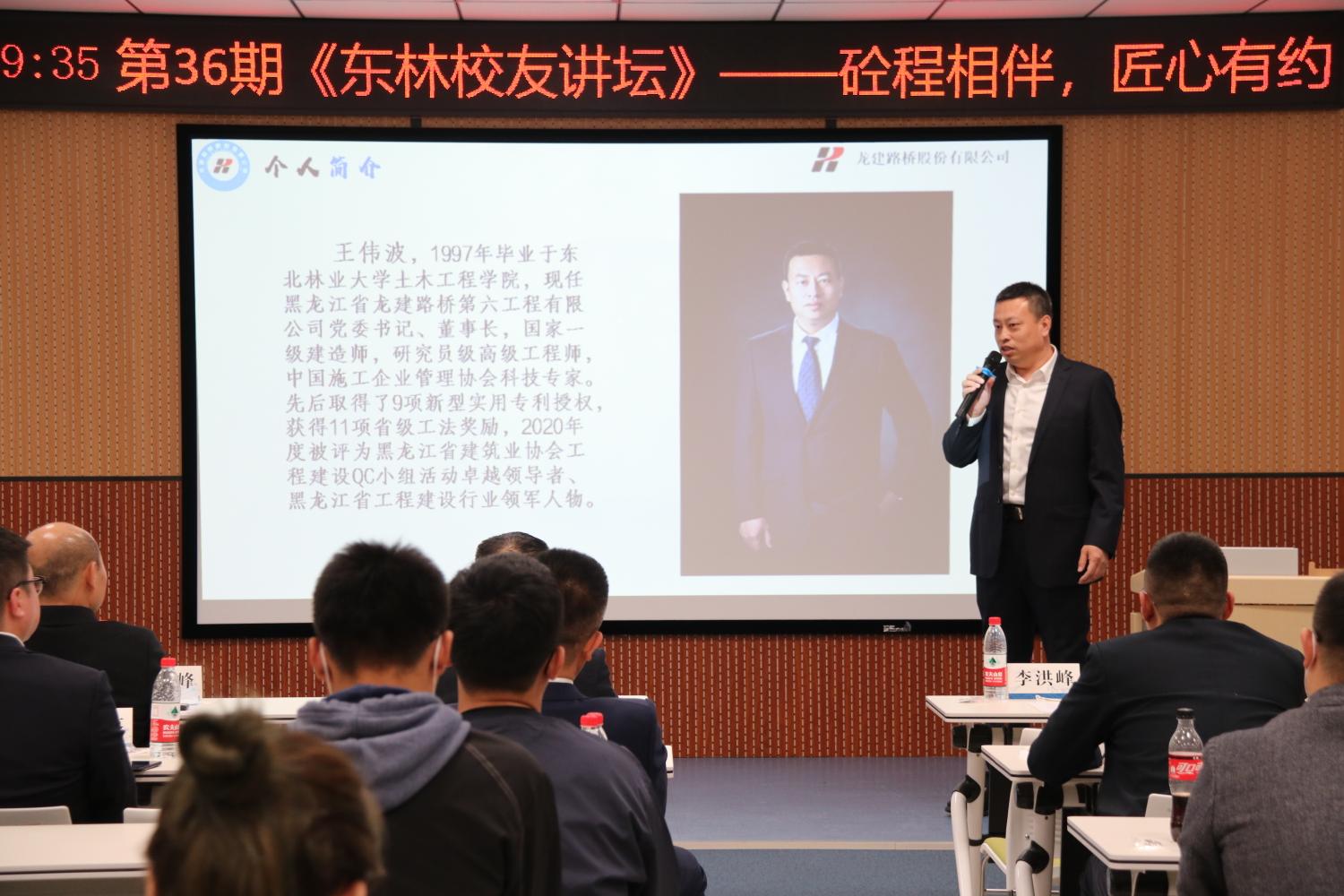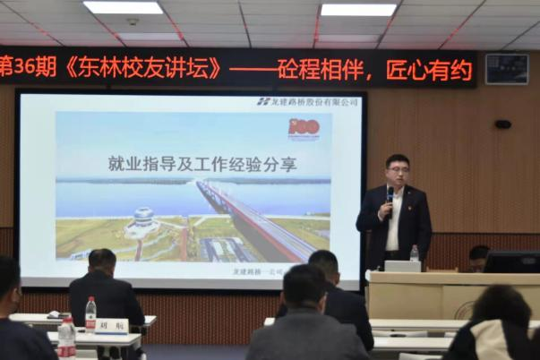 10月26日下午,龙建路桥股份有限公司陈彦君、黑龙江省龙建路桥第六工程有限公司王伟波、黑龙江省龙建路桥第一工程有限公司 史伟鉴、黑龙江省龙建路桥第五工程有限公司吕晨旭、黑龙江省龙建路桥第六工程有限公司内业技术员李金洁做客第36期《东林员工讲坛》,在公司奥林学院001报告厅,以“砼程相伴,匠心有约”为主题,为现场及钉钉直播间近千名师生深情讲述了他们奋斗多年的宝贵经验和人生阅历。Bwin必赢网址经理程培峰、公司党委书记李洪峰、校团委、员工工作办公室、就业与合作发展处等相关单位负责人一同参加了活动,活动由公司党委副书记孙维国主持。