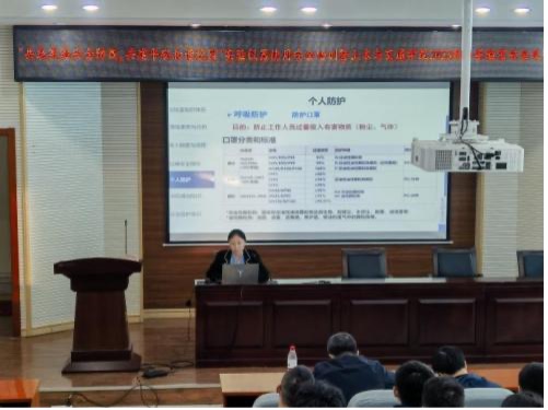 工程力学实验室赵颖老师主讲个人防护、消防基础知识及紧急救护常识部分。从头顶到脚底进行了全身的个人防护说明,借助案例说明了个人防护的重要性。讲解了灭火器的分类及适用范围、灭火毯的使用等基础消防知识,强调说明了紧急救护的措施。