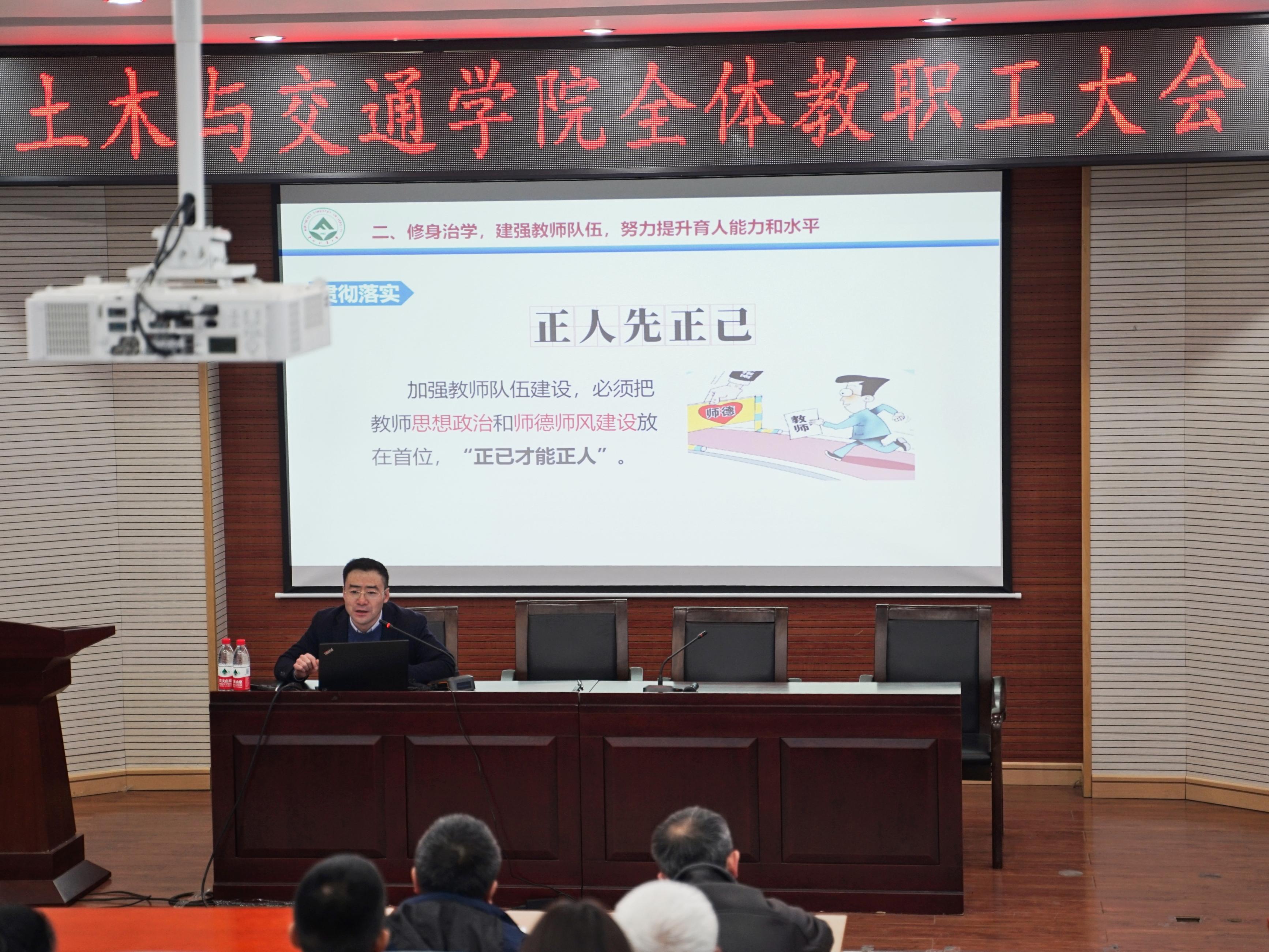 党委书记李洪峰以“奋力书写学院建设新篇章”为题为全院教职工作报告,报告从践行生态文明理念,弘扬塞罕坝精神;修身治学,建强教师队伍;树木树人,落实立德树人根本任务;守护绿水青山,筑牢生态屏障,服务国家发展战略;立足龙江,为推进东北振兴、建设美丽中国多作贡献五个方面进行分享和交流。