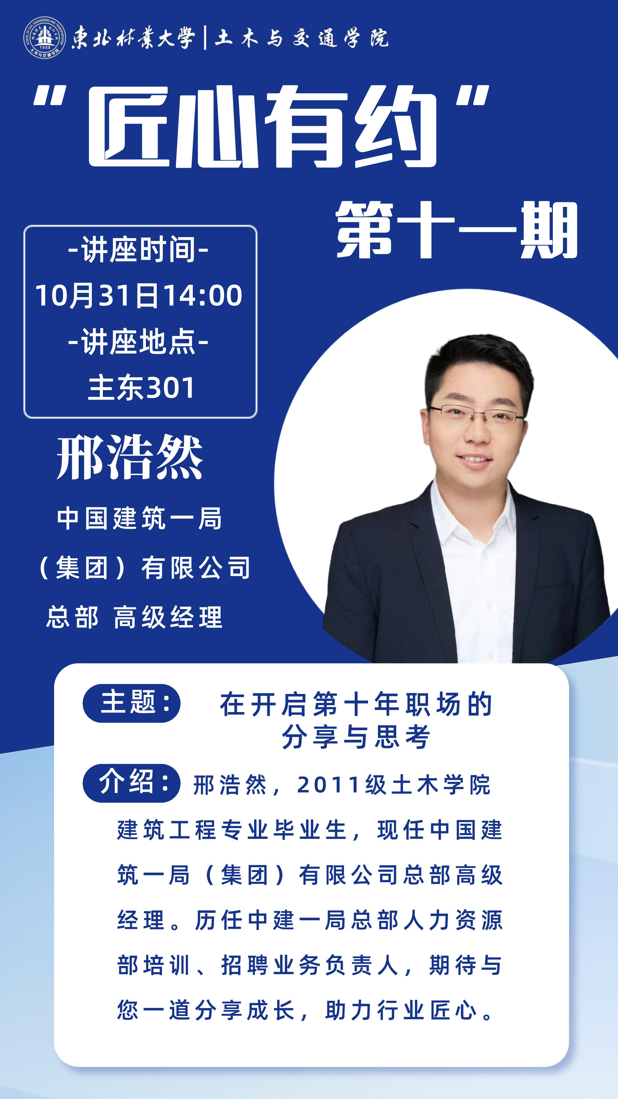 为助力同学们深入了解职场生态,精准把握个人职业规划脉络,激发同学们对未来职业道路的热情与憧憬,同时促进理论与实践的深度融合,Bwin必赢网址特邀中国建筑一局(集团)有限公司总部高级经理邢浩然,为同学们带来“匠心有约”第十一期专题讲座。此次讲座旨在通过邢经理丰富的职场经验,为同学们点亮职业发展的明灯,指引大家迈向理想职业的征途。