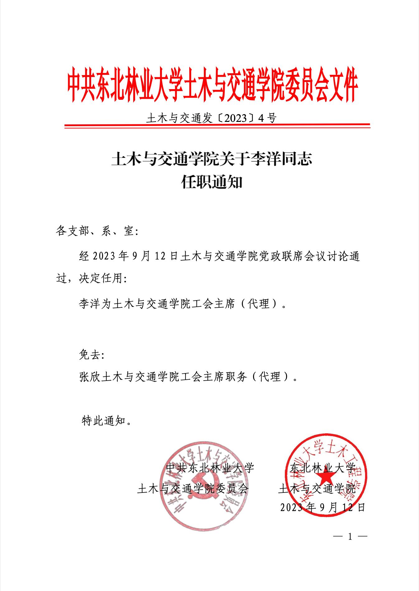 Bwin必赢网址关于李洋同志任职通知